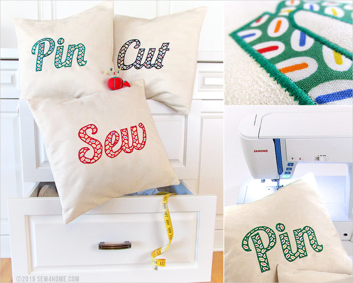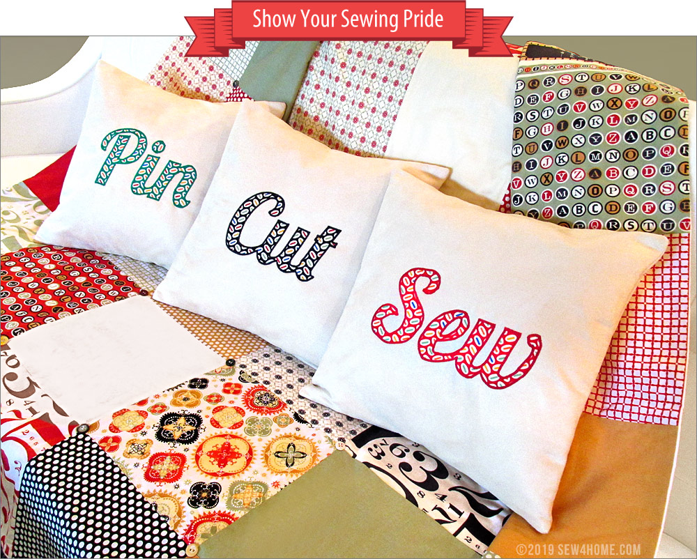 Proudly display your passion with our set of clever appliquéd pillows. They break down the craft into three easy steps: Pin, Cut, Sew! Gee… maybe our instructions are way too detailed!