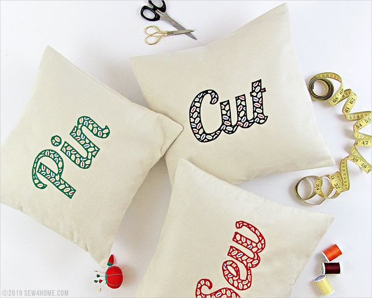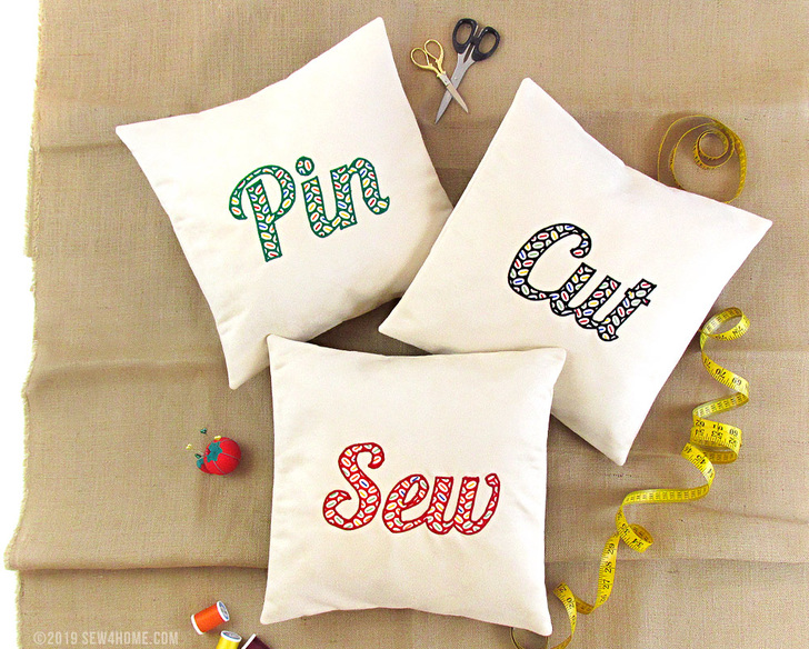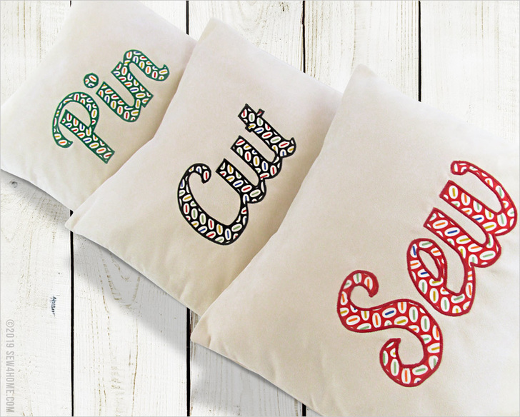- Repeat to appliqué the other two words in place on the remaining pillow fronts.