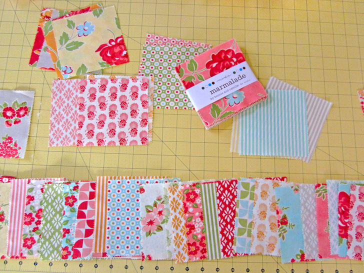 We originally used fabric from the Marmalade collection by Bonnie & Camille for Moda, which is an older collection that is no longer readily available. We again would recommend Fat Quarter Shop as an excellent option for all your pre-cut shopping.
