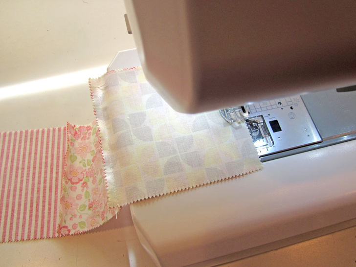 - Sew all 28 5″ x 5″ squares together end to end. To do this, place two squares right sides together and stitch along one 5″ edge, using a ¼” seam allowance. Repeat to create one long strip.