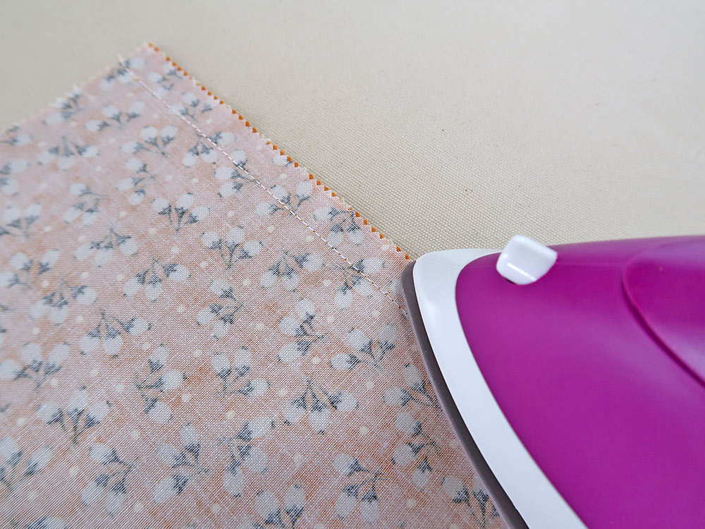 Step 1: With right sides together, press along the seam line. This is called, “setting the seam.” Your iron should be parallel to the straight grain of the fabric.
