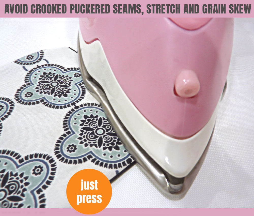 When you roller skate, you’re making a similar move to ironing, which is the process of gliding your iron back and forth over fabric to smooth away wrinkles. Ironing tends to stretch fabric a bit, and it can skew the grain (the weave of the fabric). If used within the construction process, this can result in crooked or puckered seams. Ironing is best for finished garments, and as we explain below, we like it for preparing yardage prior to cutting.