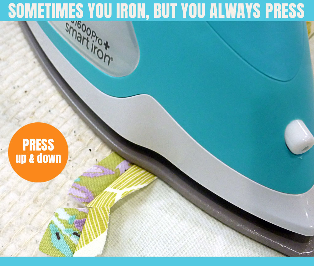 Pressing is more like jumping rope. You press with an up-and-down motion. Most pressing is done on the wrong side of the fabric. When you sew, sometimes you iron, but you always press.
