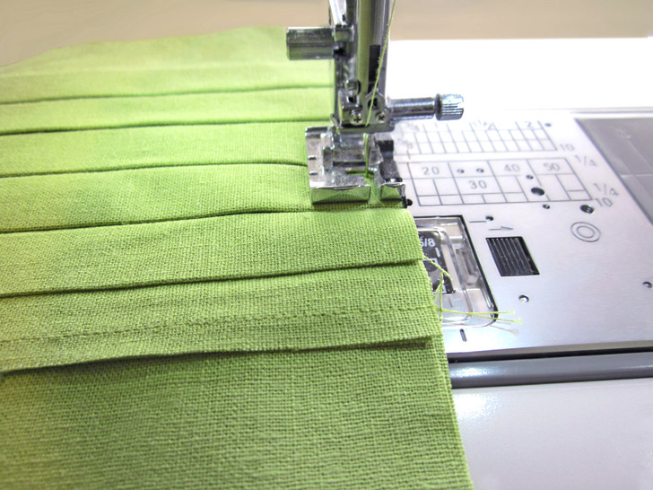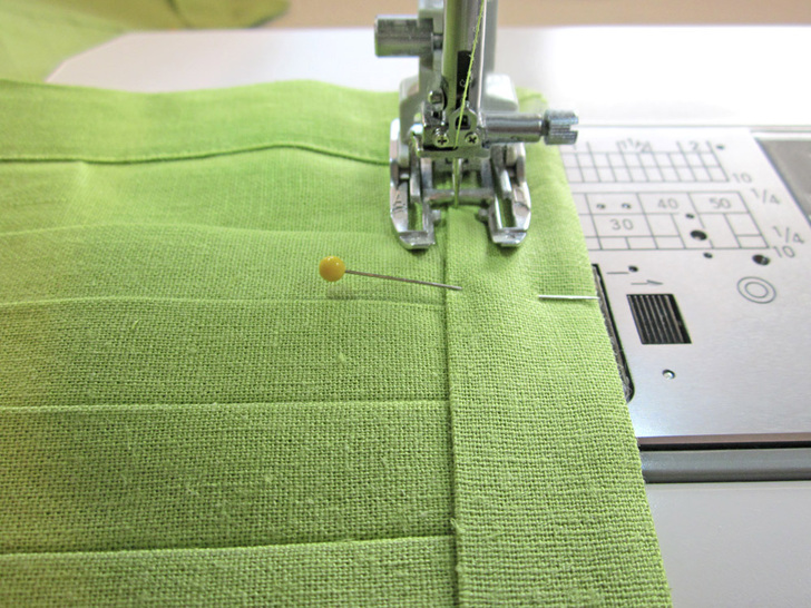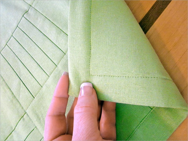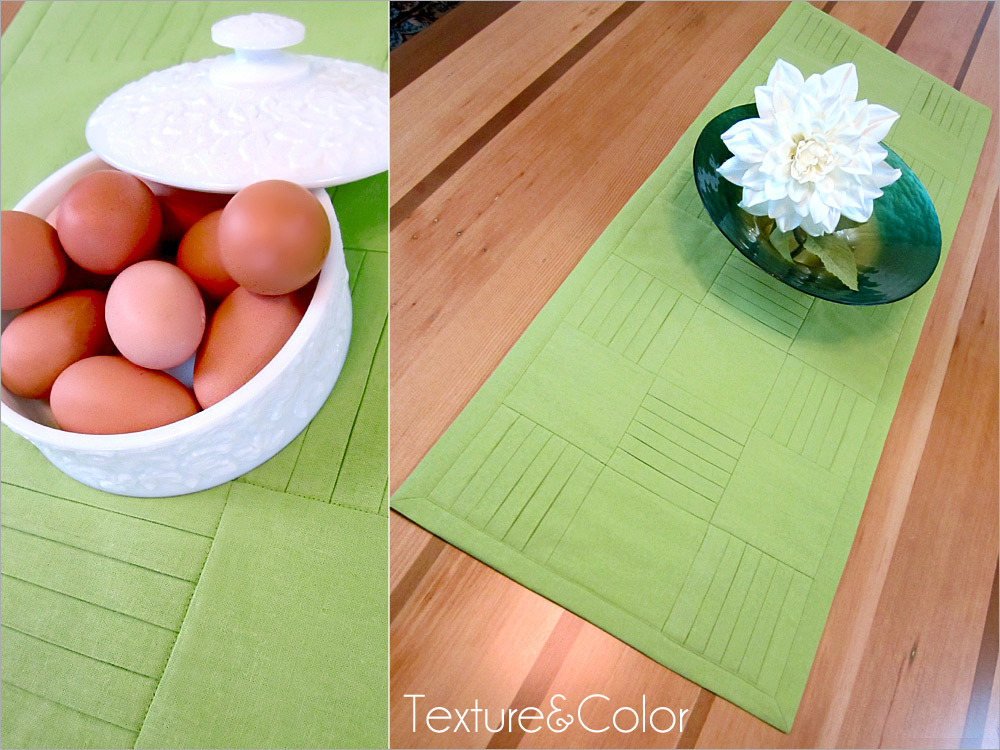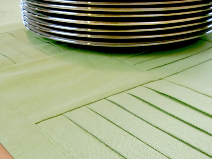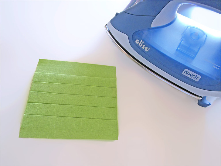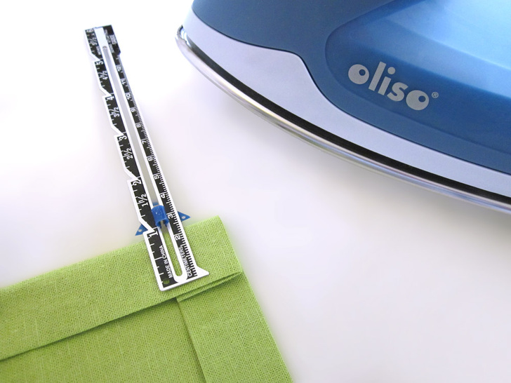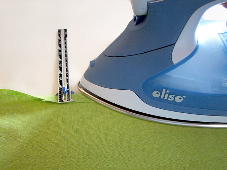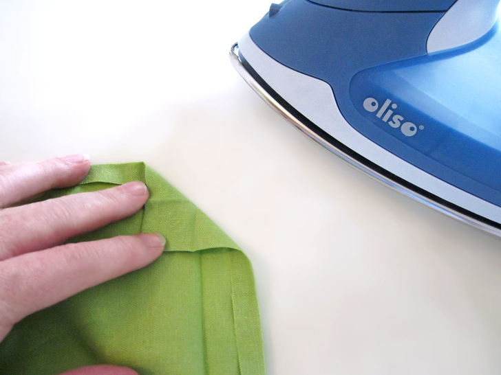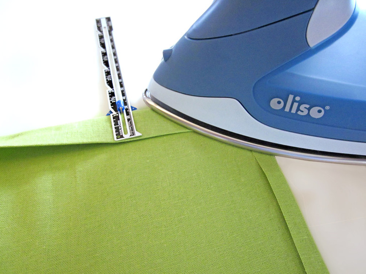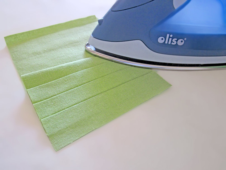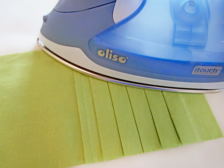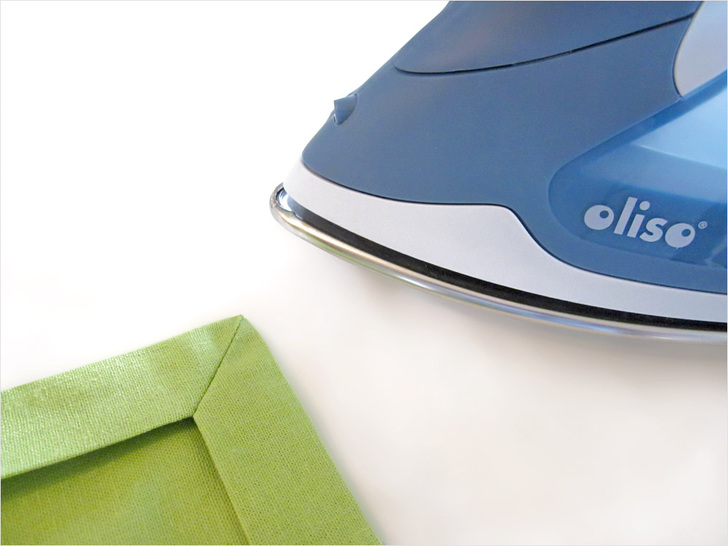 The beauty of this runner is in the texture of the pleated squares side by side with the plain squares. It looks best in a solid, which really shows off the definition. We chose a linen blend in crisp pear green – perfect for Spring. This tutorial also shows you a fun way to create mitered corners without using a separate binding strip. Our “binding” is actually the folded-over edges of the back panel; it’s binding and back all in one! There’s plenty o’ pressing in this project, so having a great iron makes it fast and easy. Here in the Sew4Home studios, we use Oliso irons. Love them – especially their iTouch® technology: touch the handle and the iron lowers. Remove your hand and it lifts back up. No more scorching, and a much more stable base.