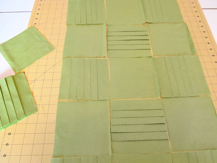 - Alternate the 5½” pleated squares with the 5½” plain squares as shown in the diagram above, orienting the pleats as shown (in essence, the pleats are all facing towards the nearest raw edge).