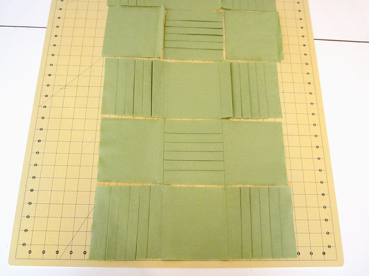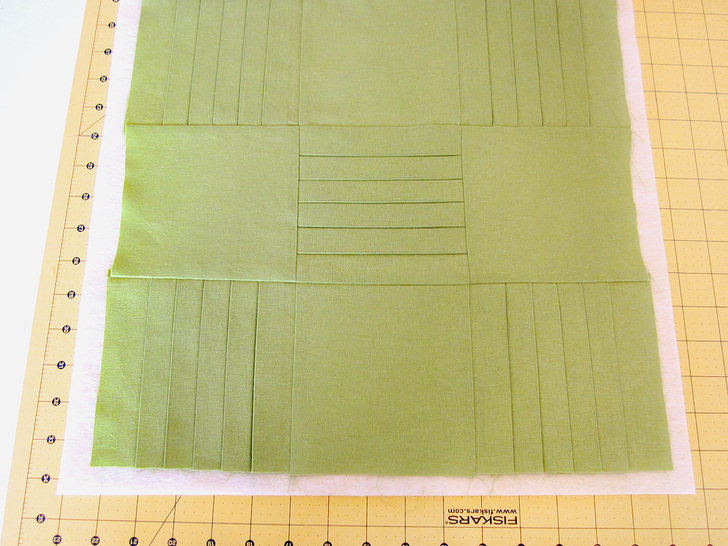 NOTE: For our pleated squares, we did not stitch along the edges to secure the pleats in place. This did reduce the bulk along the seam lines, but it also made it a bit harder to keep the pleats in place during stitching. If you are new to working with pleats, you may want to place a piece of tape across the center of the pleats. This will hold the pleats in place but will still keep the bulk at bay in the seaming. - Using a ¼” seam allowance, sew the squares together into NINE rows of three squares.