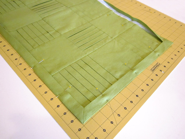 - Pin in place all around, making sure the folded edge of the backing panel evenly covers the raw edges of the quilted panel.