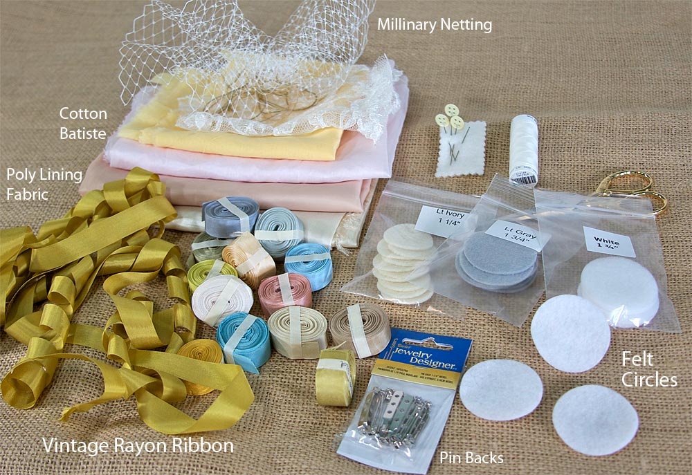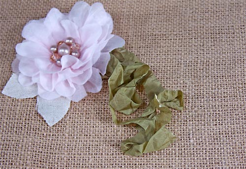 The photo below shows an assortment of the kinds of scraps that work well for this style of flower. For the petals, we show several poly lining fabrics and cotton batiste, but other woven fabrics are fine as long as the fabric is not too heavy and has a some body. For the leaves, you can use burlap, linen, felt, velveteen or even a pretty cotton print. You could also purchase a little bit of lace or netting to make the flower dressier – perfect for bridal accessories.