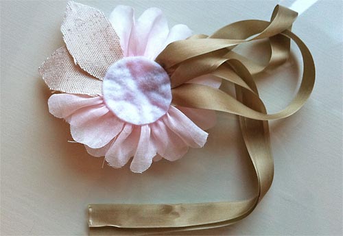 - A scrap of slightly stiffer fabric for the leaves; we used burlap for the yellow flower and linen for the pink flower