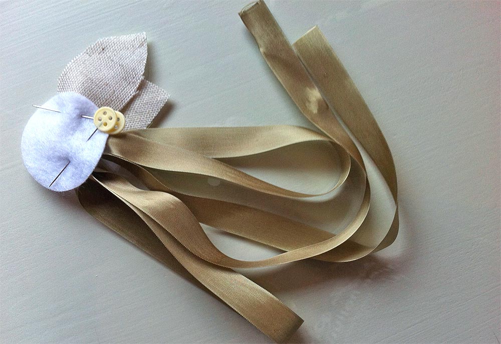 - Tie your ribbon in a big loopy bow and pin the ribbon and leaves to what will be the inside of the felt circle.