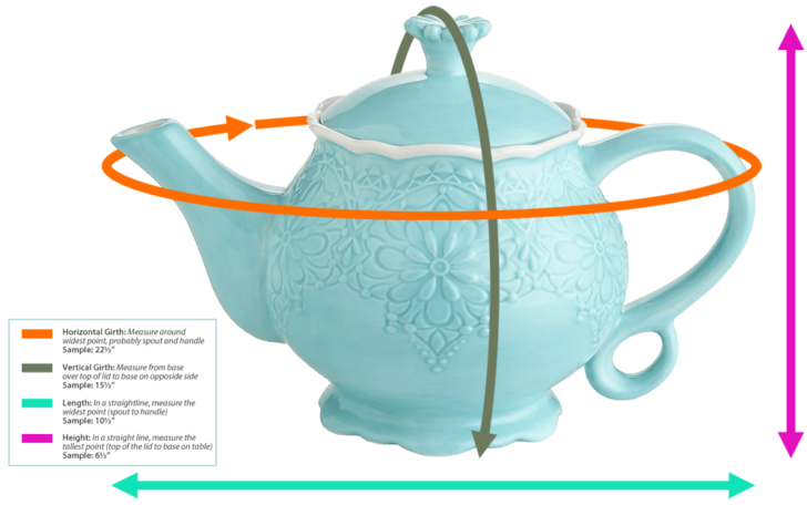 Her teapot measures 6.3 inches high; 10.2 inches wide; horizontal surround is 23.6 inches and vertical surround is 20 inches. Looking at it, I think I can use your measurements – could you possibly confirm? I’d be so grateful.