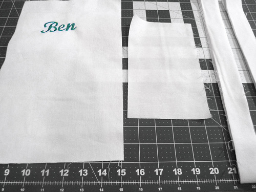 If monogramming, cut ONE pocket rectangle big enough to hoop; it will be cut down after embroidery to 8″ wide x 13″ high