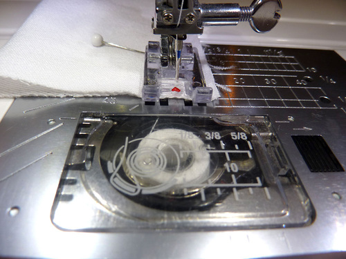 - Re-thread the machine with invisible thread (or thread to match the ribbon) in the top and thread to match the fabric in the bobbin.