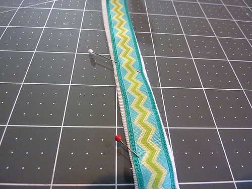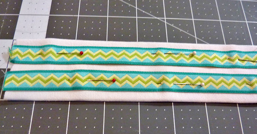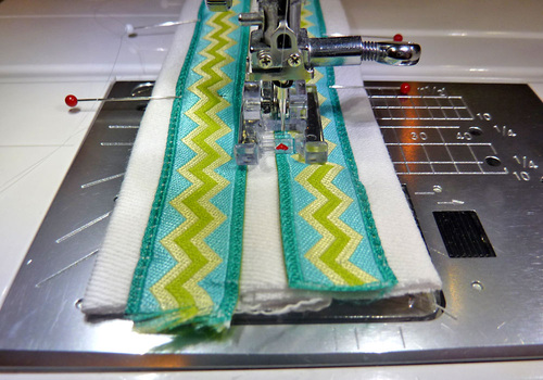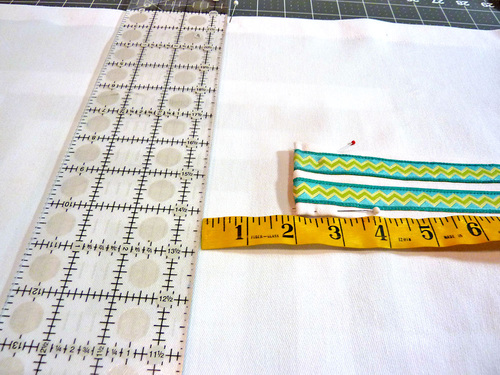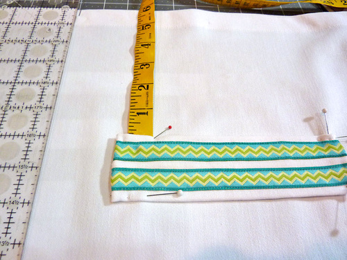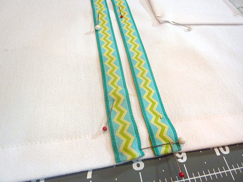 - Press flat. Place the two ribbon lengths horizontally across the front surface. The outer side edge of each ribbon should be ¼” in from the folded edge of the fabric, and there should be ¼” between the two ribbons. Pin in place.