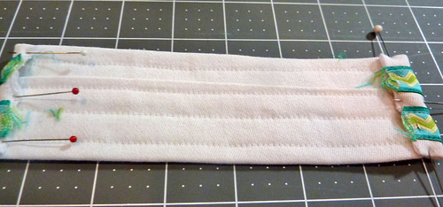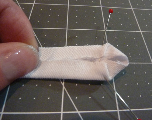 - Fold back the raw edge of the ribbon and the point of the fabric so the two layers are flush. Heavily pin the ends together like a little porcupine. The opposite end of each tie remains raw.