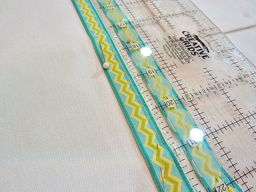 - Center a length of ribbon on each strip, concealing the fabric’s raw edges beneath the ribbon. Pin or fuse in place.