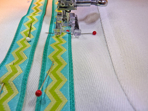 NOTE: You’ll notice we used pins to hold our ribbons in place. Another option would be to apply a little basting glue or a strip of lightweight fusible web, such as Stitch Witchery by Dritz. - Re-thread the machine with invisible thread (or thread to match the ribbon) in the top and thread to match the fabric in the bobbin. To secure, stitch along both sides of each ribbon.