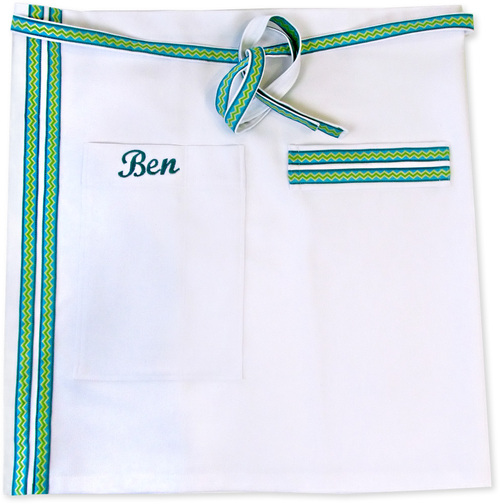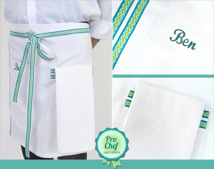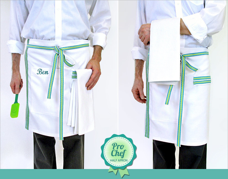One of the great features on this apron is its handy towel loop. Not only does the horizontal band give us an excuse to add two additional ribbon accents, it’s a super functional detail designed to hold a standard kitchen towel. We know pro-chefs are the messiest chefs!