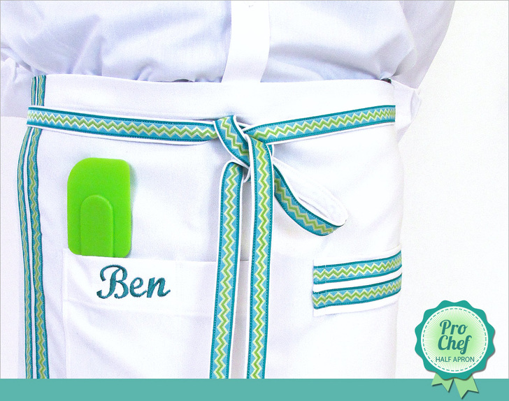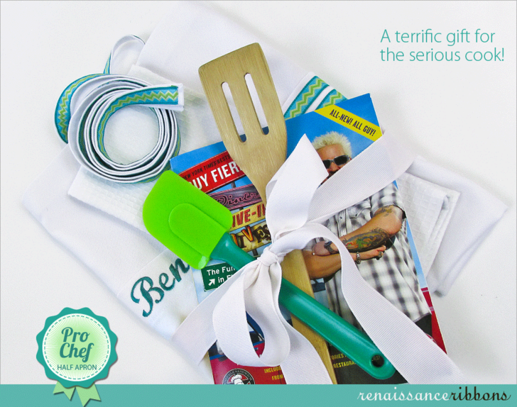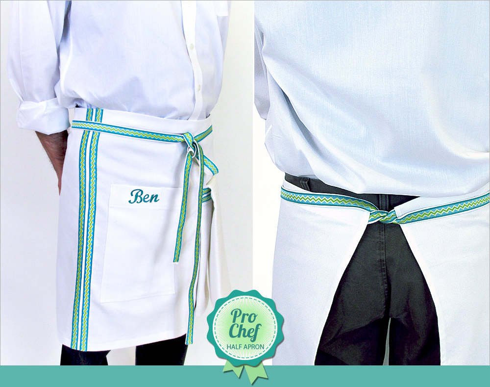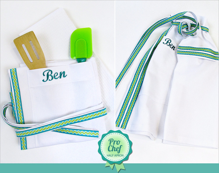 Although we originally made our sample for Pro Chef Ben, the simple sizing means it will work equally well for any of the chefs in your midst. Simply pick out ribbon accents to match the wearer’s favorite colors and patterns.