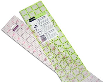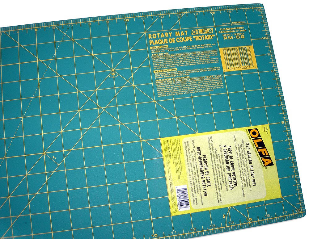 Mats and Rulers? Hey, wait a minute, I thought we were talking about cutters. Indeed we are. To really use your rotary cutter, you will need to invest in two other supplies at the same time. The first is a self-healing mat. These are made a of special substance that “heals” when you cut on it, so you don’t create a gash through the mat each time you cut your fabric. They are available in a wide variety of sizes. For your primary mat, get one as large as your cutting surface and storage area will allow. You can’t roll cutting mats like a poster, so keep in mind they need to be stored flat. If I were ever to put mine away (it just lives in my dining room) I would probably store it under the bed. The most common size is 36″ x 24″. If you can accommodate a larger mat, go for it. But really, 24″ is the smallest you can go and still comfortably and accurately cut your fabric.