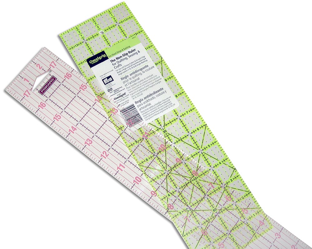 You’ll also need a non-slip ruler to cut against. Don’t try to use a regular yardstick when cutting fabric with a rotary cutter. Non-slip rulers contain a special feature that resists slipping, so you can safely cut your fabric. Sometimes this is a gripping lip that hangs over your mat, sometimes it’s a gritty texture that holds the ruler in place, and sometimes the backing of the actual ruler allows it to stay in place when pressure is applied. These rulers are also especially helpful for accuracy in your cutting; they contain lines that indicate 30˚, 45˚ and 60˚, and have markings every 1/8″. You’ll want your primary ruler to be 6½” x 24″ or 8½” x 24″. It’s also nice to have an additional square and/or smaller non-slip ruler.