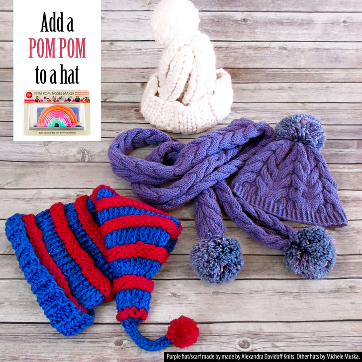 How adorable are these hats from Michele? The poms really add a finishing touch, and we love the look of the pom pair at the ends of the knit scarf!