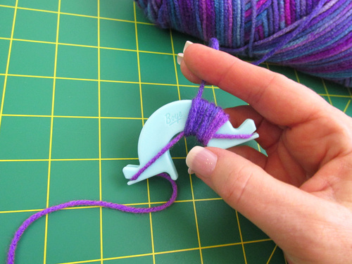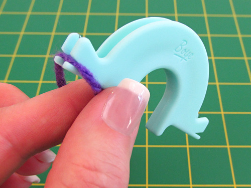 Pull out your yarn, and keeping a nice long tail (12” – 18” is what we worked with), snap the yarn into position in the left notch at the top of the form.