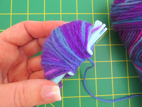There are 10 sizes of forms for the poms, from the giant 6″ down to the teeny tiny ¾”. The last two itty bitty sizes are full circle forms rather than half circles, but the process is really the same. You can use all sizes and types of yarns, although Michele did recommend mixing in a bit of polyester if you choose a 100% wool yarn as it tends to not be a strong and could break with the pulling as you wrap. Blending in the polyester helps prevent that.