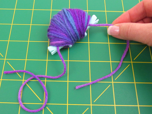 Keep wrapping until the bottom “arch” is filled in and level. You can almost feel the yarn start to “fall off” – a good signal you have enough. But really, the number of wraps is totally up to you and the thickness of the yarn with which you’re working. Want a looser pom? Wrap less. Want a super chubby pom? Wrap a lot.