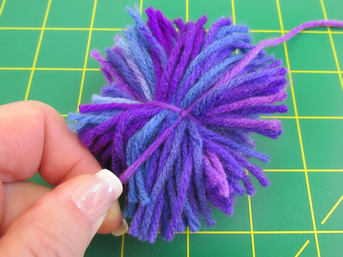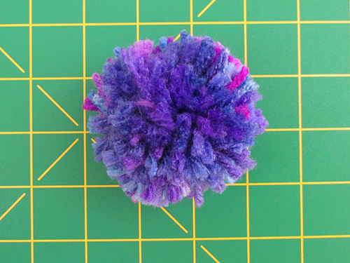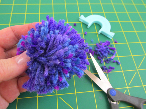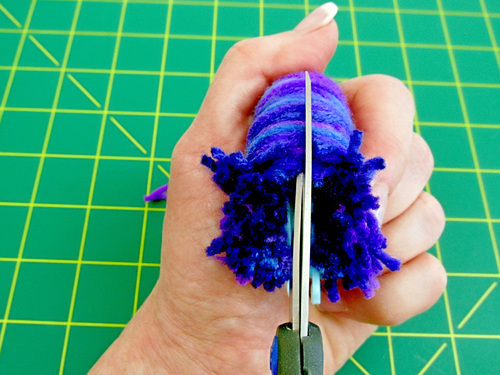 Fluff up the pom into its basic round shape, then use the scissors to give it a hair cut in order to get it as dense and/or fluffy as you’d like. There’s also a trend right now for totally untrimmed poms with a natural kind of swirly, tangly look.