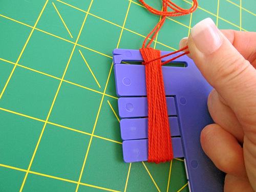 Cut a long length of floss that will act as your main tie. Center the length across the very top of the tool, securing it in the little slits at each side. The longer the length, the more you’ll have to work with at the end as a “hanger.” Remember, you can always trim it shorter, but you can’t make it longer, so start with plenty.