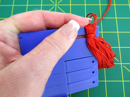 Unlock that original top horizontal length of floss from the side slits, and tie the tails together to the secure the top of the tassel.