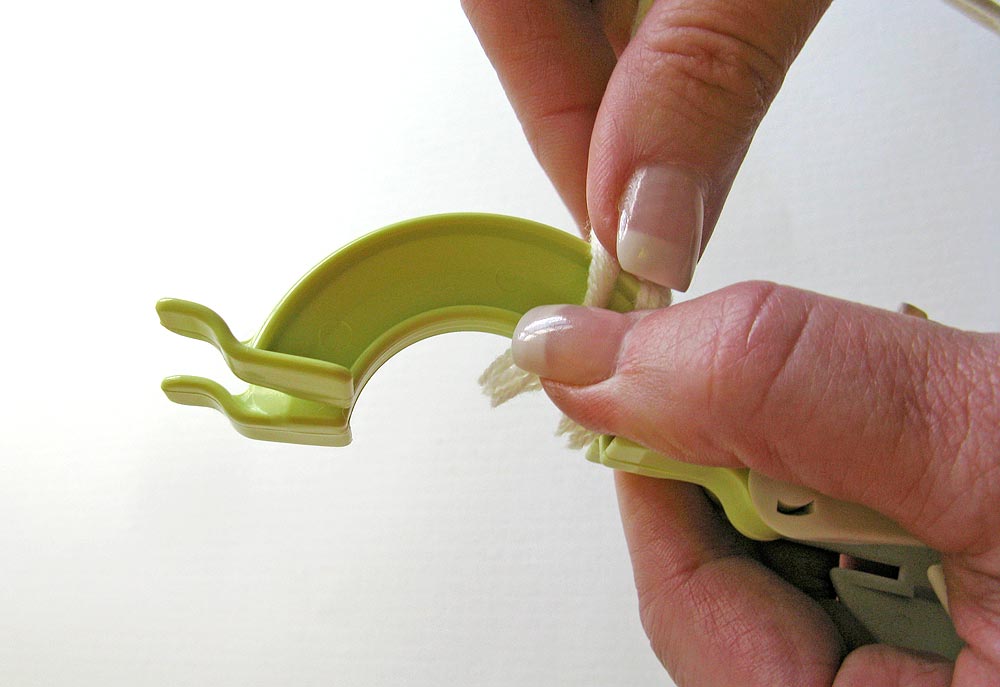6. Holding the tool securely closed with one hand, use a pair of sharp scissors with longish blades to cut the yarn. Simply slide the tip of the scissors in between the arms and clip, running the blades up and over the arc. This takes a little bit strength because you’re working the tips of the scissors; just keep your pressure slow and even.
