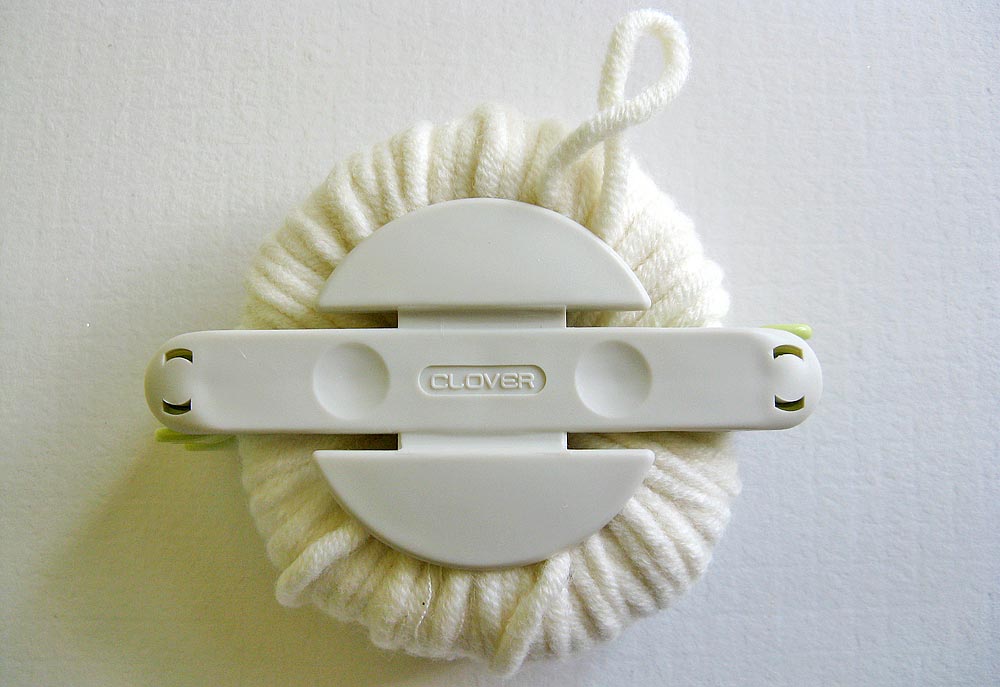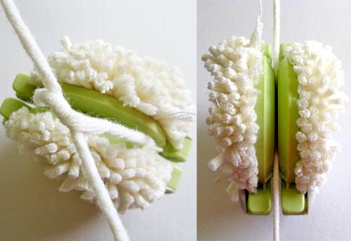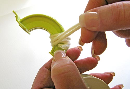 10. Slip the length of yarn in between the two discs of the tool and tie a simple knot. Secure with a second knot, pulling it nice and tight.