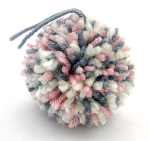 Our demonstration pom is done in a simple white yarn, and solid color poms are the most common. However, it’s easy to make multi-color poms. Use just a few strands of coordinating colors, or go wild with half and half poms and other fun combinations. We show you some basic steps below for a simple multi-color pom and a variegated pom. If you do decide to go pom crazy, you can learn to create super intricate designs within your poms, like flowers or stripes as well as specialty shapes. Tutorials are available online, and we have a favorite book that shows a wonderful range of unique styles: Make Your Own Cute and Easy Pompoms