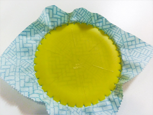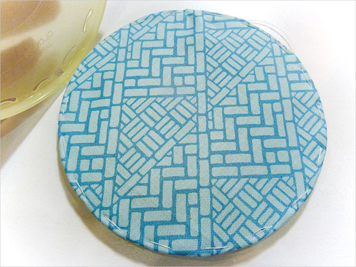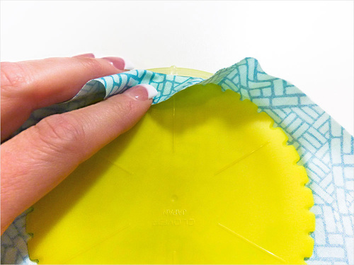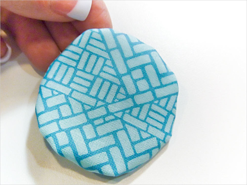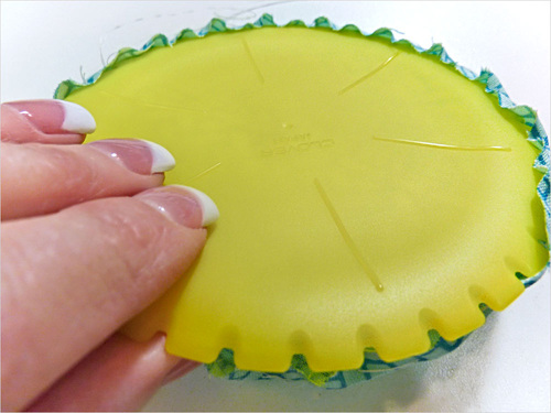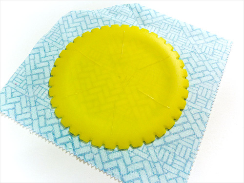 - Your fabric scrap or pre-cut should be about 1” larger than the disc all around. Place the disc on the wrong side of your fabric.