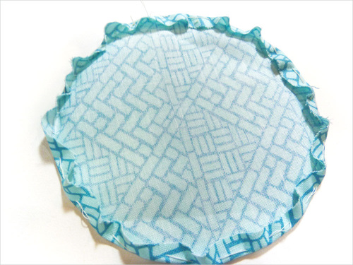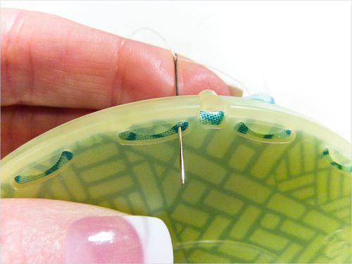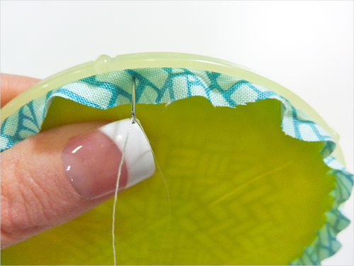 - Fold the raw edge of the fabric towards the center of the circle. To start, insert the needle from the disc side, going through one end of the curved slot.