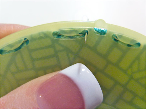 NOTE: These curved slots run around the perimeter of the plate and are what allow your to keep your stitches even and precise. Make sure your needle is going in and out at the outer points of each curve not through the center.