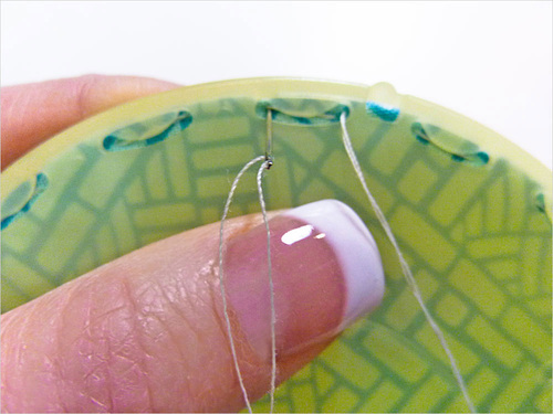 - Continue this up-and-through then down-and-through pattern around the entire plate. When you get back to your starting point, make one additional stitch in the first curve.