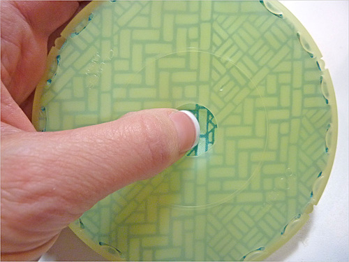 - There are raised diagonal lines on the discs, like the wedges of a pie. Pick up the disc and fabric in one hand and place them into the plate. Align the diagonal lines of the disc with the corresponding small raised bumps on the plate.