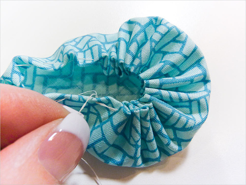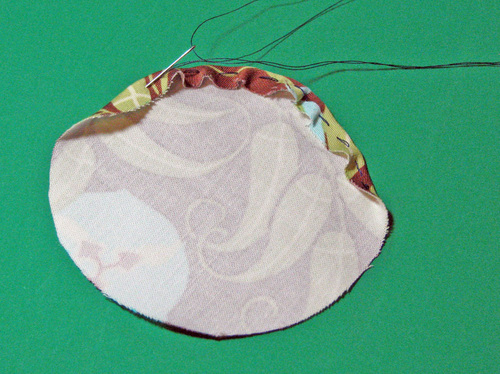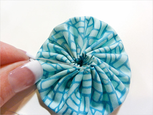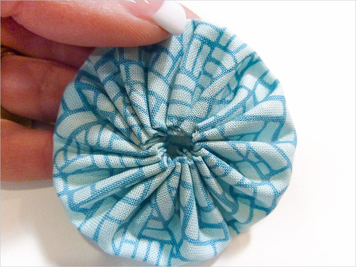 - Gently pull the thread to gather the circle into its yo-yo shape. You can help it gather by gently folding in the creases with one hand as you pull the thread to gather with the other.