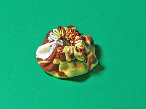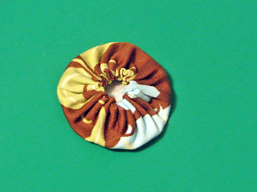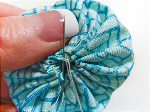- Gently pull on the ends of the thread to gather the sides of the yo-yo, tie a knot with the ends of the thread and clip the thread tails.