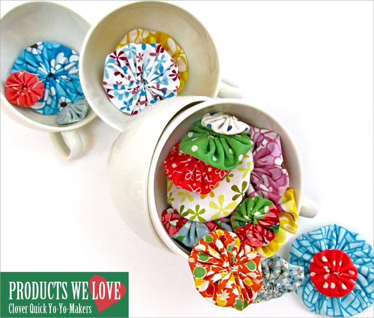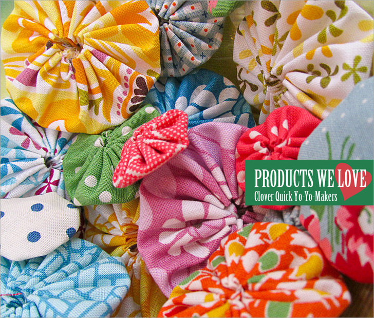 There’s no research confirming a link between the classic yo-yo string toy and the fabric yo-yo, but they are both round, both peaked in popularity in the 1930s-40s in the United States, and both are pretty, dang fun! So, we’re happy to link them together as two points along a playful continuum. A fabric yo-yo is a small, ruched rosette. It’s most often associated with quilting, and antique yo-yo quilts can be quite stunning, but it’s a fun bit of dimensional embellishment that can be used on any number of projects. At it’s simplest, the yo-yo is just a small gathered circle. When cinched up tight it produces a smooth “button” effect on one side and a pretty rippled confection on the other. You can make them by hand, and we summarize those steps below, but we prefer to use the Clover Quick Yo-Yo Makers. These small plastic devices are incredibly affordable, and make the job of stitching yo-yos easier and more uniform.