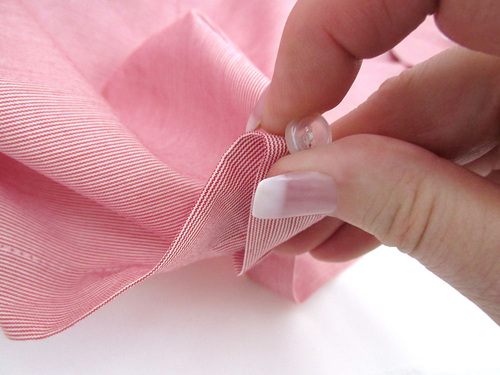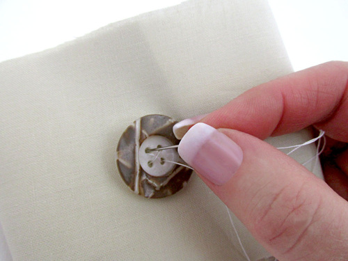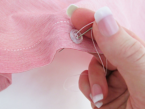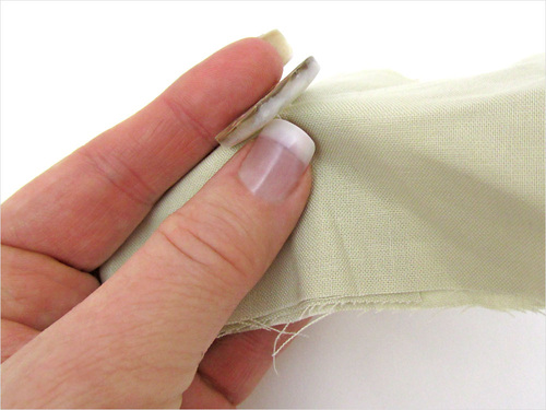 Just because it’s secured doesn’t mean you can never get it off. If you need to remove a button you certainly can. We used our seam ripper to cut through the thread, pulling the remnants from the fabric without a problem. Once the fabric was re-pressed, you can just barely see the remaining holes.