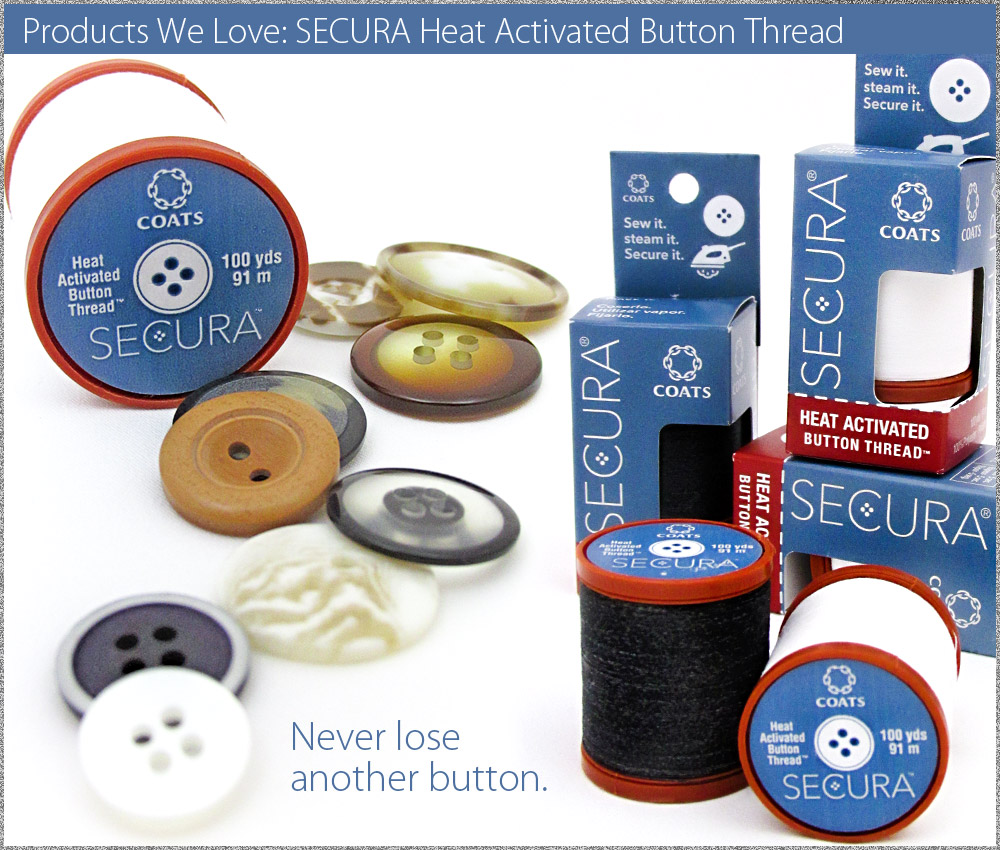 Secura is a heat-activated polyester button thread. It creates a super tight seal that can eliminate the problems of loose or lost buttons.
