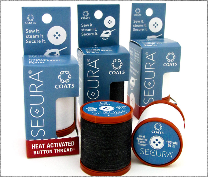 Buttons are among the most basic methods of fastening one thing to another. They also make a pretty embellishment all on their own. We love them lots… until they come off. And, they almost always come off, especially from store-bought items, which often seem to be sewn with some kind of “quick release thread.” If you’re tired of buttons coming loose or popping off, you are going to love the new Secura Button Thread from Coats. It sews like regular thread, but the secret comes when you’re done sewing. Steam the sewn button from the back for just a few seconds and the heat activates the thread’s coating, allowing it to stick to itself. It doesn’t stick to the fabric or the button – just to itself.