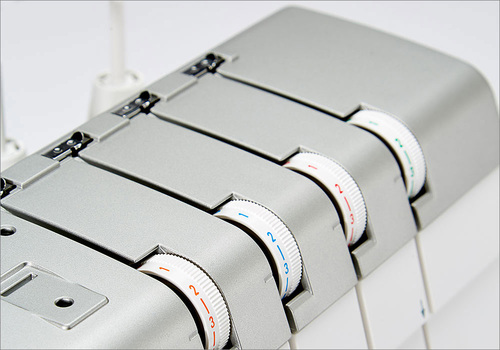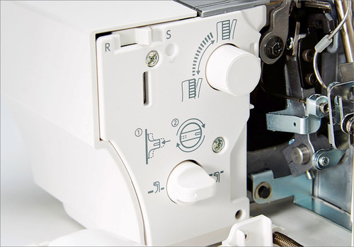 Getting your serger stitches just right means being able to adjust several factors. Janome added some very cool features to the AirThread 2000D to make this uncomplicated. The Stitch Length Adjustment and Differential Feed Adjustment have been integrated into one dual-function knob… so smart! Fine adjustments, like cutting width, as well as access to the upper knife release and the stitch finger lever for rolled hemming are now consolidated on the right side of the large sewing bed for quick access. You can also adjust foot pressure with one dial so the machine can accommodate a variety of fabric thicknesses as well as several optional presser feet.