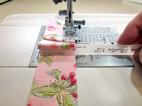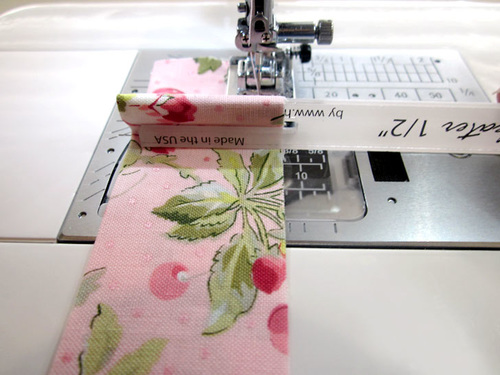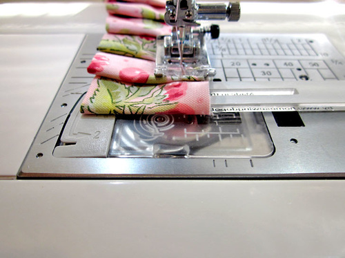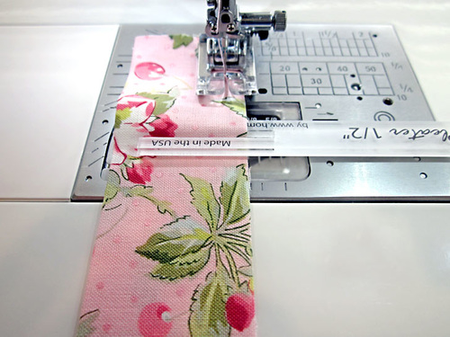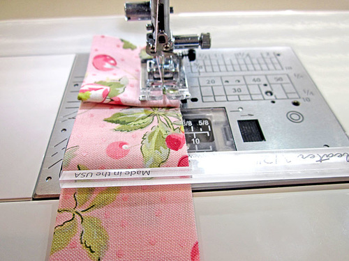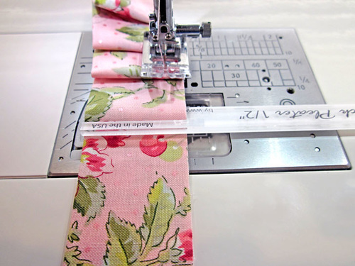 Place the fabric under the foot, ½” from the raw edge (for a ½” seam allowance). Insert the Quick Pleater with the fork closest to the needle on top of the fabric strip and the fork closest to you under the fabric strip (yep… this is the opposite of what you just did above for the knife pleats).