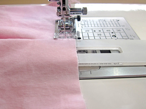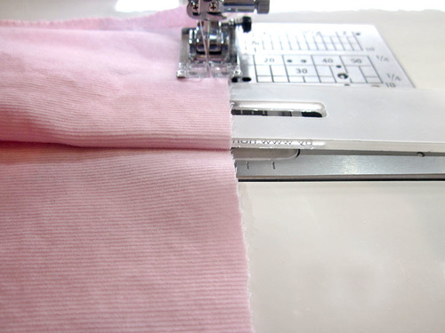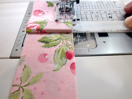 Adjust the position so the second pleat just touches the first pleat, and as above, make sure the folded edges and raw edges of the fabric are even. Stitch forward to secure.