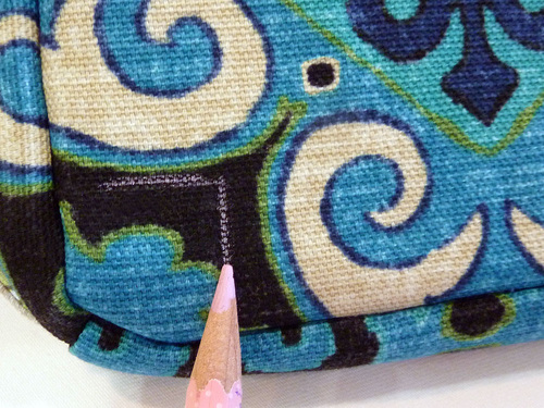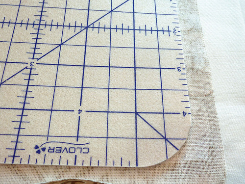 - With your pocket cut to size, place the Hot Hemmer on the wrong side of the fabric. Position the curve of the Hot Hemmer at the bottom corner of the pocket where you want a curved edge.